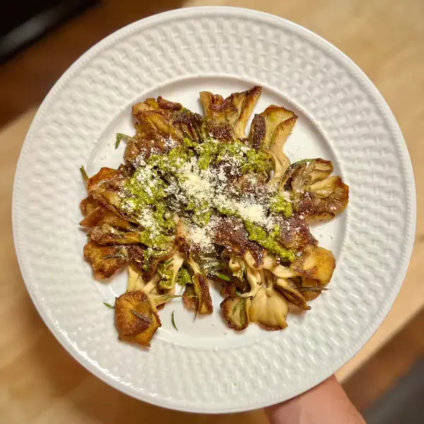 Dressage : servez immédiatement les pleurotes croustillants, nappez de pesto et saupoudrez de fromage râpé. Un plat simple, gourmand et spectaculaire, parfait en entrée ou en accompagnement !