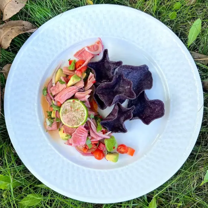 Servez votre ceviche bien frais, accompagné de chips de tortilla pour tremper et savourer.